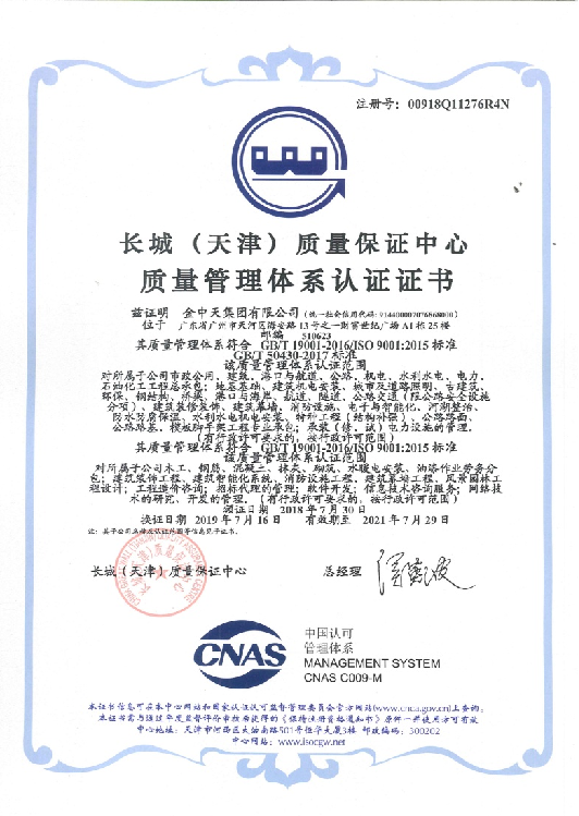 集团公司连续十八年被广东省工商局评为“守合同、重信用”企业,被中国质量信誉评价中心评为“质量、信誉、服务AAA级”企业,被中国银行和中国建设银行评为“信用等级AAA级”企业。并通过了ISO9001质量管理体系、ISO14001环境管理体系及ISO45001职业健康安全体系认证,实现了三位一体的管理体系。